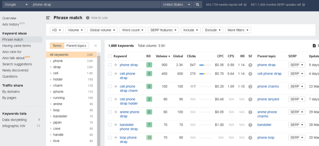 Considera que tienes una pequeña empresa que vende correas para móviles. Puedes explorar más ideas clave analizando algunas palabras básicas, como «correa para móvil», «correa para teléfono móvil», etc. Debes fijarte en el informe denominado «Coincidencia de frases»: