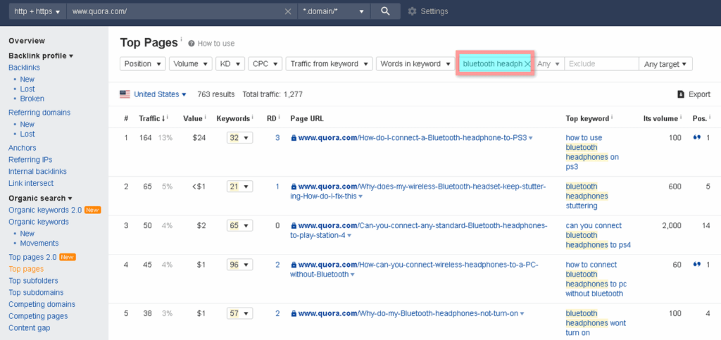 Encuentra preguntas con potencial comercial, utilizando herramientas específicas como Site Explorer de Ahrefs. Explora la lista con las preguntas que generan más tráfico.