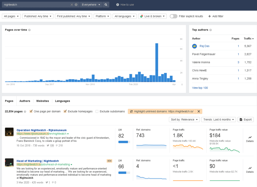Una de las mejores opciones sería usar la herramienta Content Explorer de Ahref. Simplemente escribe el nombre de la marca de tu servicio o de tu producto y filtra los resultados aplicando el filtro «Un enlace por dominio». La único que queda por hacer es subrayar las menciones sin enlaces a tu dominio.