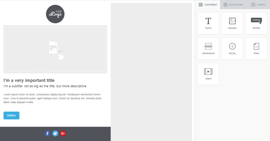 Como siempre en BEE, se puede trabajar con un e-mail ya definido o con un modelo nuevo. Para nuestro ejemplo, partiremos de este último supuesto. Veamos el aspecto de la plantilla limpia: