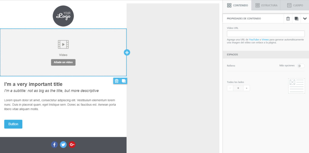 El primer paso, por tanto, es seleccionar un bloque de contenido de Vídeo y arrastrarlo al cuerpo del e-mail donde tenemos intención de visualizar el vídeo.