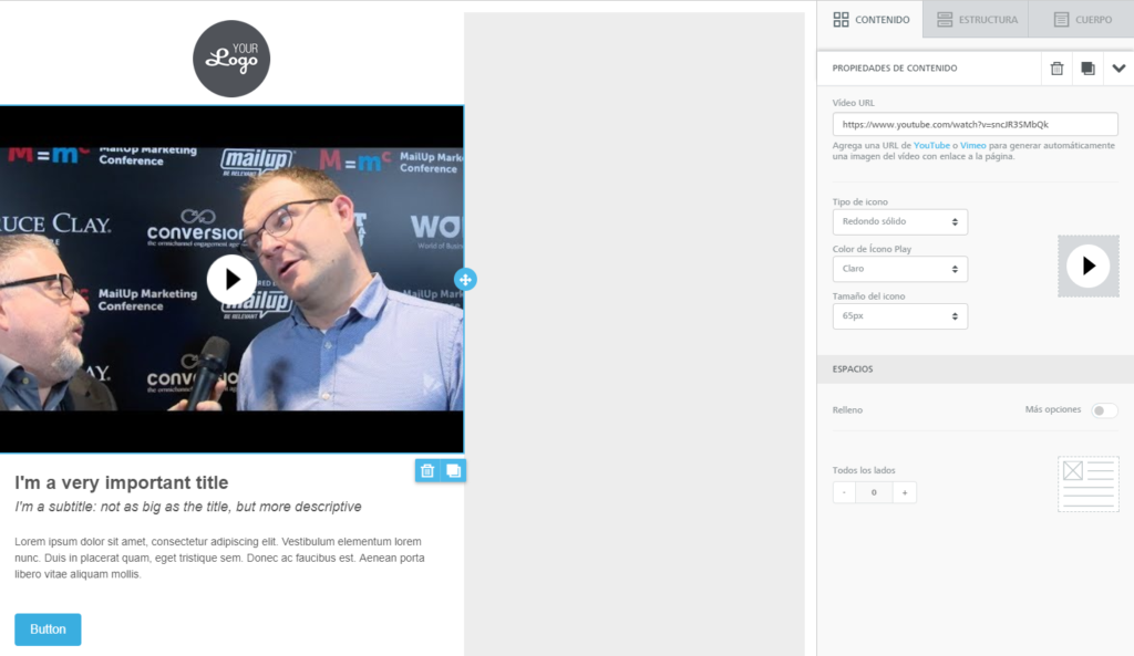 Ahora nuestro editor de arrastrar y soltar, BEE, integrado en la plataforma, permite añadir en los mensajes la vista previa de los contenidos de vídeo sin necesidad de añadir un código incrustado, superando así todos los problemas expuestos.