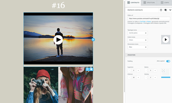 Para introducir la vista previa en la fase de creación del e-mail, es suficiente con copiar la URL del vídeo cargado en YouTube o Vimeo y pegarla en el bloque Vídeo. ¡Y ya está! BEE se ocupa automáticamente de todo lo demás: recupera la vista previa del vídeo, la introduce en la plantilla utilizando la imagen de portada y añade la tecla Play.